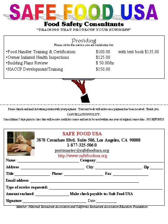 Safeguard your operation now by making sure your employees are properly trained and educated in a continually updated food handler certification program. Safe Food USA, offers the National Restaurant Association Serving Safe Food, Food Handler Training Course. We are certified by Los Angeles County Department of Health Services to provide food hadler training. Servsafe is the most comprehensive program available in addressing foodservice sanitation issues, and is accepted as the national standard by over 95% of all state and local jurisdictions. You will receive a nationally recognized certification after passing an 80-question exam. You will learn about: